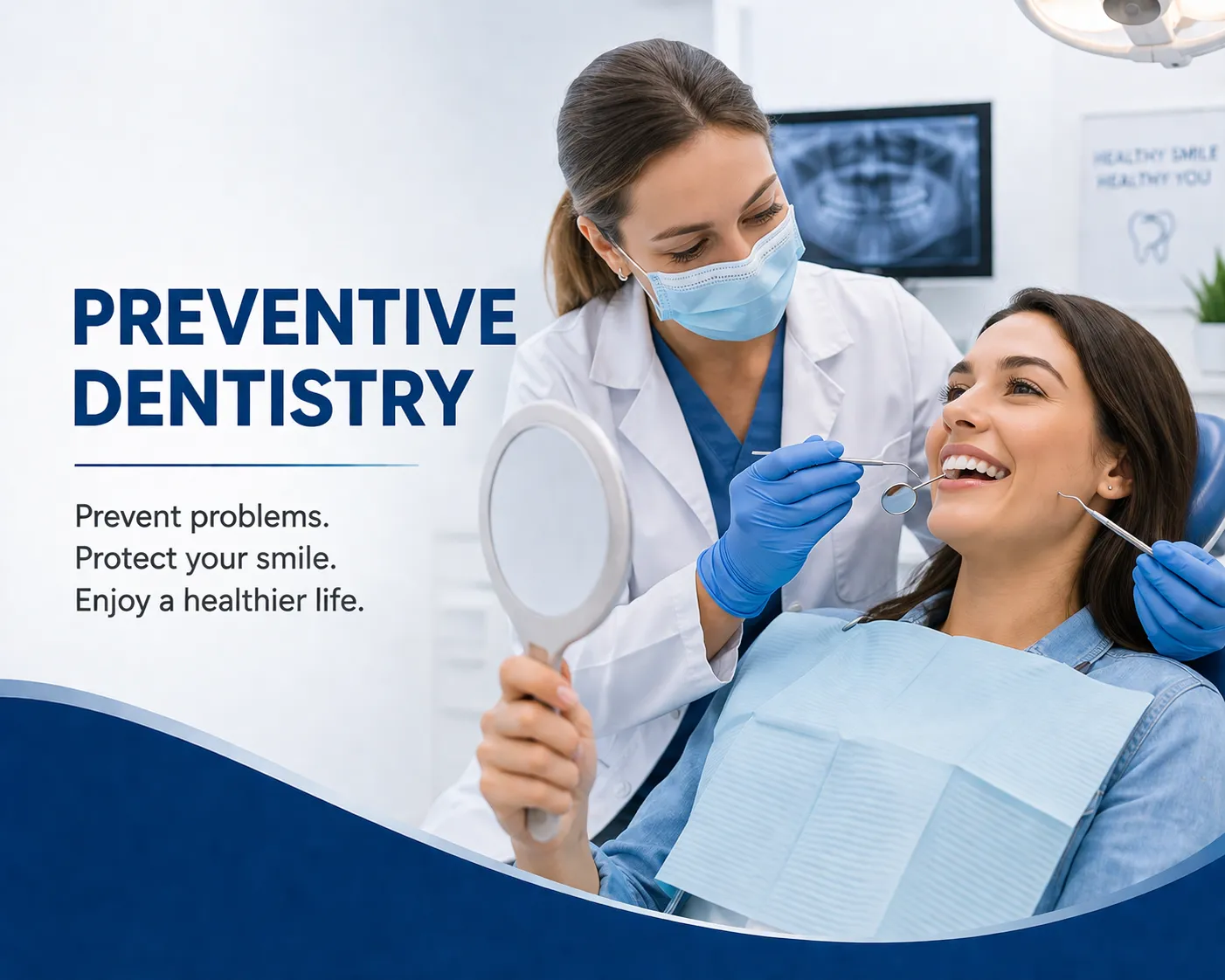 Preventive dentistry is routine oral care that includes regular checkups and cleanings, as well as daily brushing and flossing.